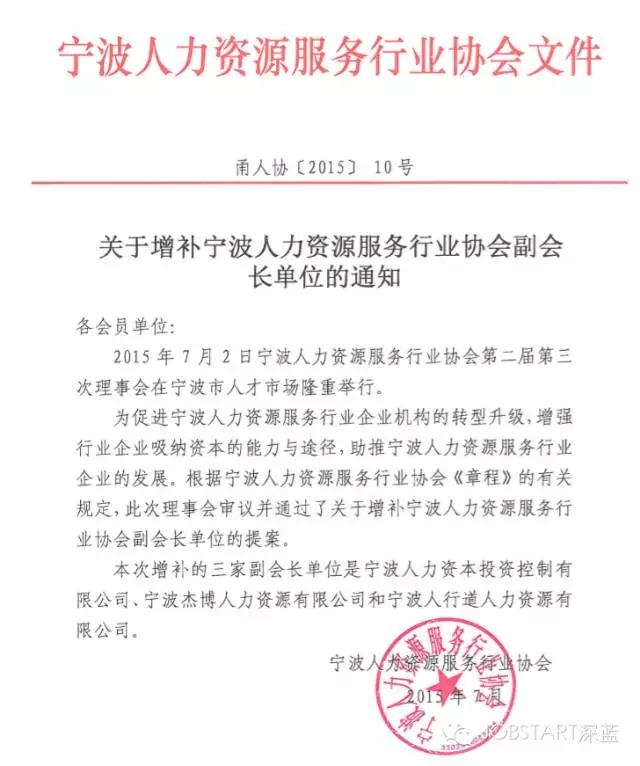 2015年7月2日(周四)下午,寧波人力資源服務(wù)行業(yè)協(xié)會2015年第二屆第三次理事會在寧波人才市場舉行,杰博人力資源在本次理事會上,被推選為協(xié)會副會長單位。