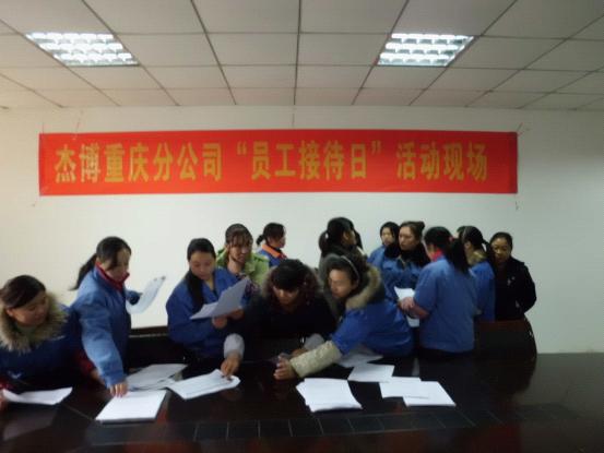 為更好的傾聽員工心聲,切實(shí)幫助員工解決工作上存在的困惑、生活上遇到的問題,本著“關(guān)心工作、關(guān)心生活、關(guān)心成長”的杰博服務(wù)文化,“為客戶服務(wù)的心,永無止境;為員工服務(wù)的心,永無止境”的服務(wù)宗旨, 致力于成為中國人力資源服務(wù)行業(yè)“員工服務(wù)效率”和“員工滿意度”最高的人力資源服務(wù)機(jī)構(gòu)的服務(wù)目標(biāo),2011年12月23日我司聯(lián)合客戶單位舉辦了杰博重慶分公司“員工接待日”活動(dòng)。